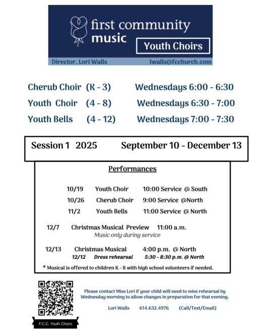 In an emotionally safe environment, the Youth Choirs at First Community Church provide a loving community for children as they explore music literacy and vocal technique. Children in the choirs become active and confident participants in worship as they bring their song of praise and prayer to God.
